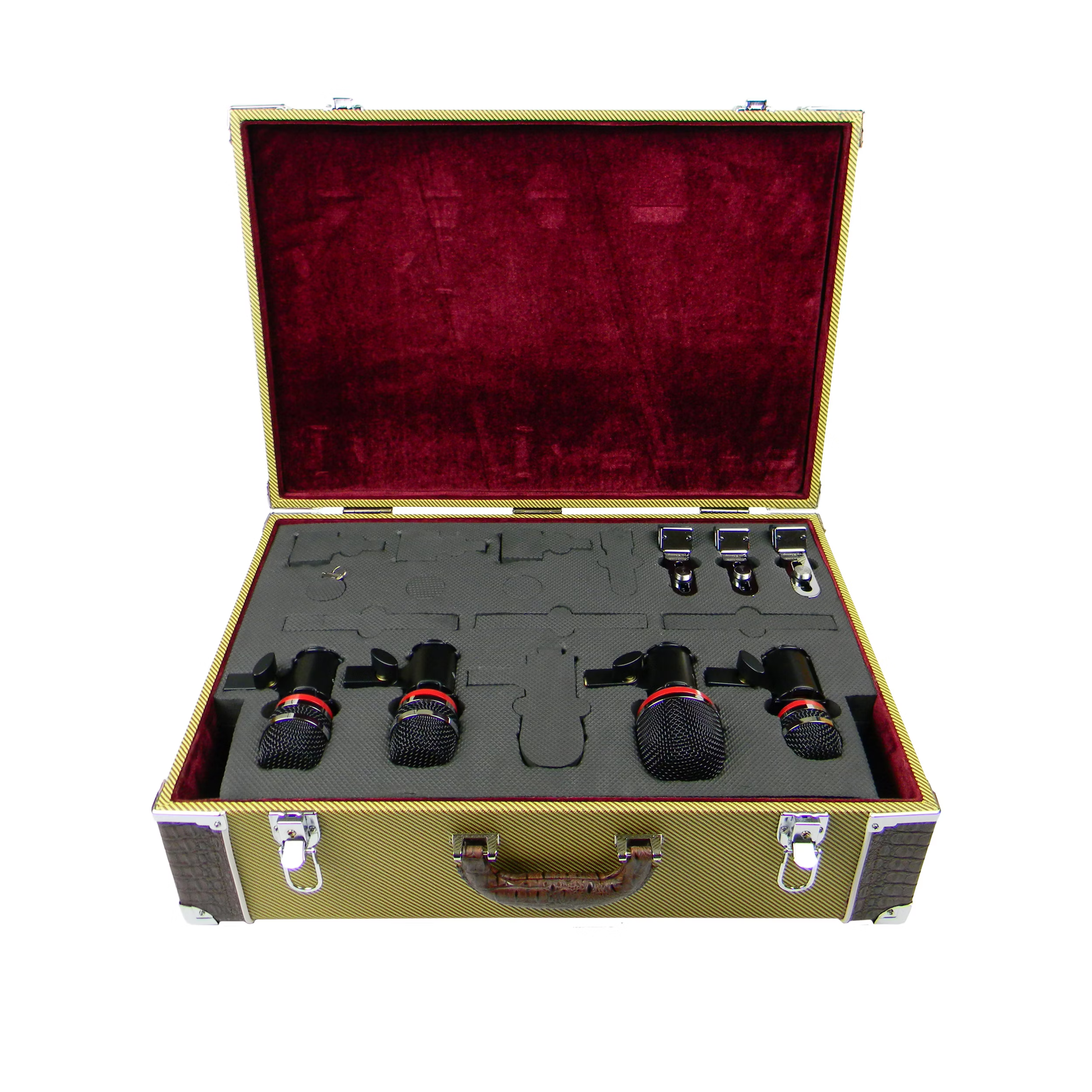 The custom vintage tweed case is hand-built for heavy-duty storage. The metal corners, locking latches, high-density foam tray, and plush lining make this case very roadworthy while offering a visually unique design. Aesthetically, the case features a tweed and faux-alligator trim exterior, with a Cabernet wine-red plush lining. The slotted foam tray not only protects and stores each component of the drum mic kit, but also lifts out of the case to provide storage for cables, sticks, etc.Â