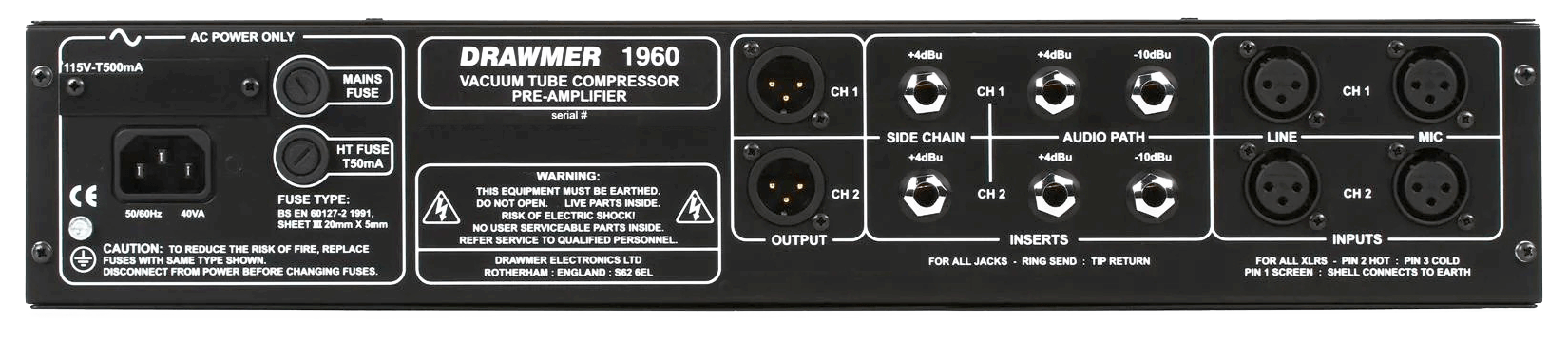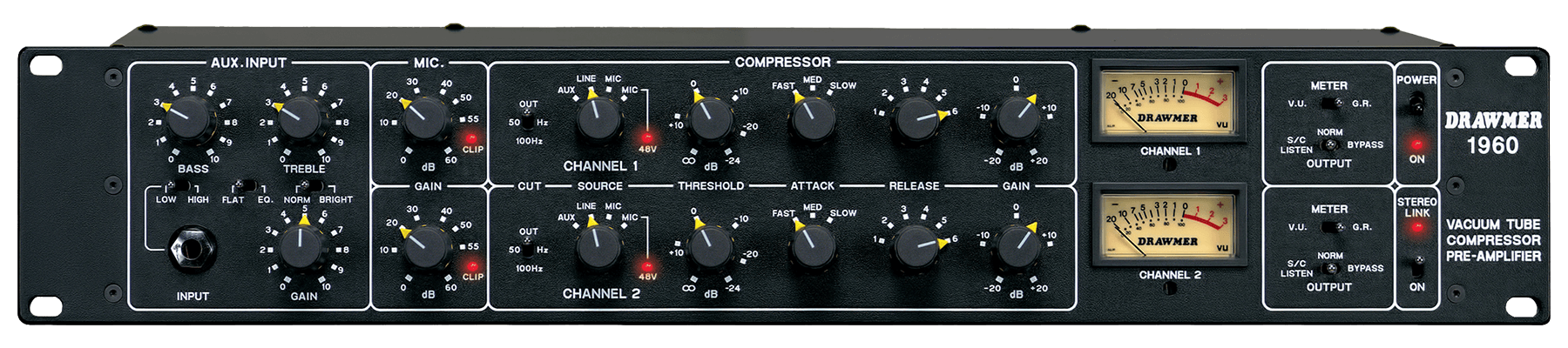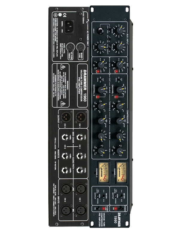 The Drawmer 1960 is a two channel unit with each channel comprised of a completely natural sounding "soft knee" vacuum tube compressor and an extremely low noise microphone pre-amplifier with switchable 48 volt phantom power. A further auxiliary instrument pre-amp with EQ is also provided. This powerful combination of the classic valve circuit, offering unsurpassed tonality, and the low noise balanced microphone input with up to 60dB of gain has allowed engineers throughout the world to exploit the full potential of high performance condenser microphones. An example of this would be the direct to digital stereo recording of live classical music without the necessity of a mixing console.