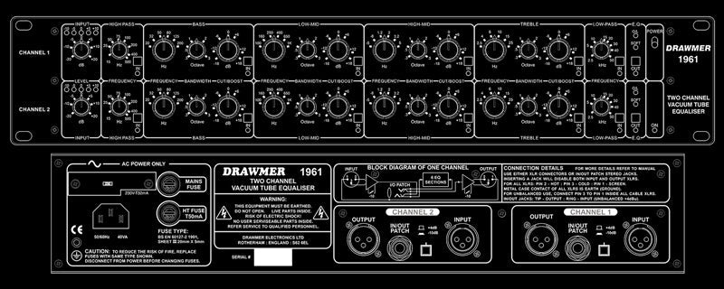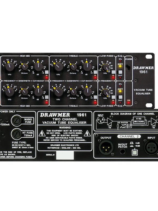 It has long been recognized that vacuum tubes impart a unique 'warmth' and 'musicality' to an audio signal, but many of the 'classic' tube equalizers fall short of the technical performance demanded in today's digital recording age. Designed to complement the widely acclaimed Drawmer 1960 Mic Pre-Amp Vacuum Tube Compressor, the 1961 Vacuum Tube Equalizer combines low noise circuitry with no fewer than twelve active tube stages to provide two channels of exceptional equalization possessing unique 'personality'.