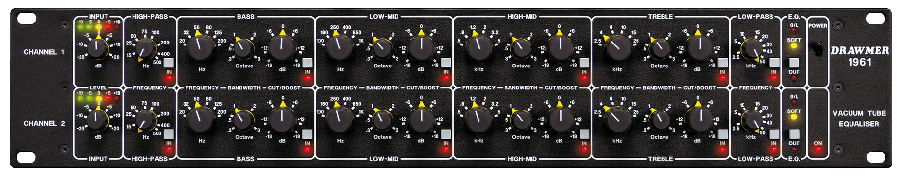 Each channel of the 1961 has four main equalizer sections with six carefully chosen overlapping frequencies and a separate tube stage for increased harmonic clarity. Each section also includes variable band width from 0.3 Octave to 3 Octaves and +18dB of Cut and Boost. BASS frequencies (Hz) 20, 32, 50, 80, 125, 200. LO-MID frequencies (Hz) 100, 180, 250, 400, 650, 1K. HI-MID frequencies (kHz) 0.5, 0.8, 1.2, 2.0, 3.2, 5.0. TREBLE frequencies (kHz) 2.5, 4, 6, 10, 15, 25.
