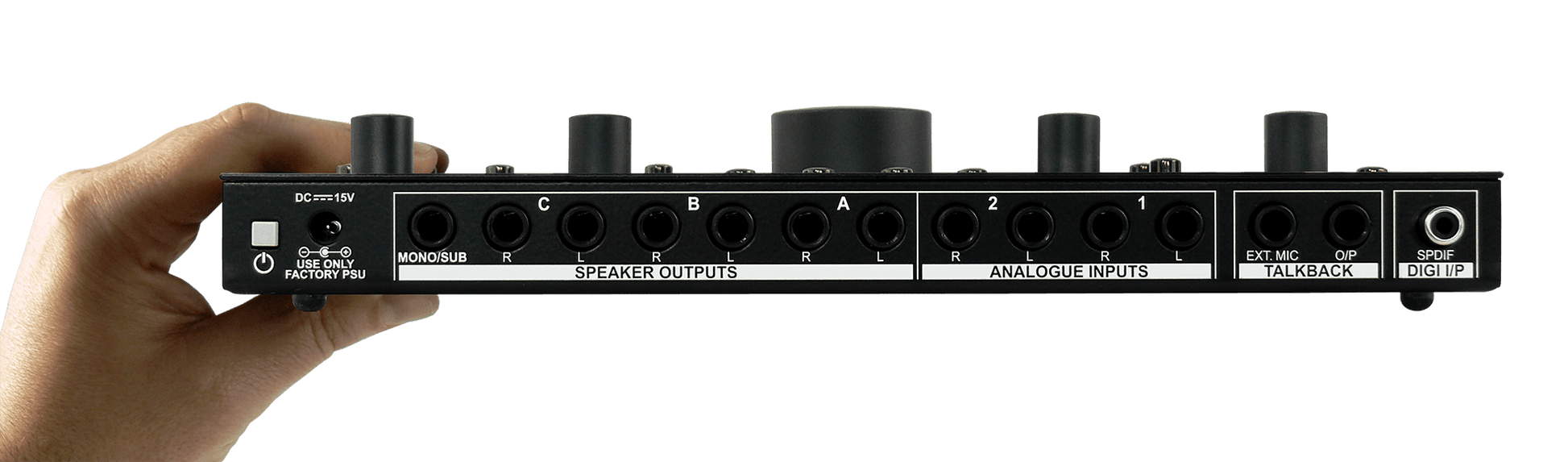 The volume control utilizes a parallelled custom quad pot for excellent channel matching and smooth feel, as does the secondary preset volume control on the front. This provides repeatable calibrated output level for the monitors, so that at the flick of a switch the engineer can hear the mix at the same predetermined volume, time after time, without having to meticulously adjust controls.