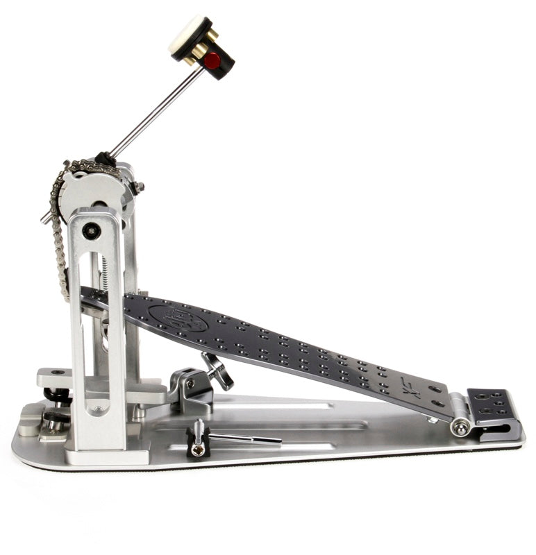 Chain-drive Single Bass Drum Pedal with Solid-aluminum Construction, Sprocket-less Cam with Gear Shift Adjustment, Tri-Pivot Swivel Toe-Clamp, and V.E.R.T. Vertical Sliding Spring Adjustment - Polished, Extended Footboard