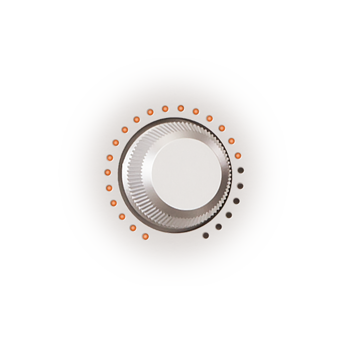Adjustments to the acoustic environment can be made via the front rotary/pressure encoder, the SMART-knob with rotating LED ring. This knob allows the levelling of system volume as well as the adjustment of filters for room variables (low shelf, mid eq and high shelf filters). All settings are displayed on the LED ring, providing instant information about the selected values. The brightness of the LED ring can be adjusted for dark studios or video applications.