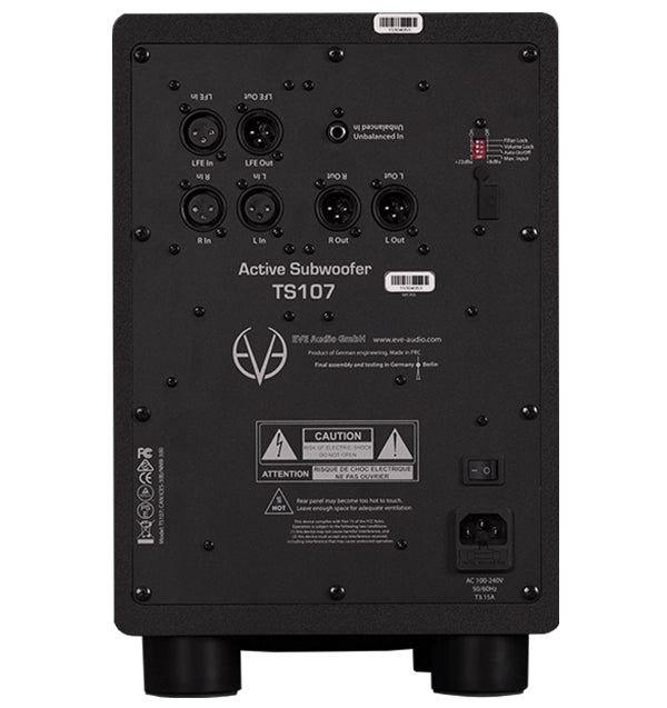 As with every other EVE Audio subwoofer, you get balanced XLR In- and Outputs (Stereo In and Out, LFE In, LFE/Sub Out) for greater convenience. In addition, TS107 features an unbalanced input for connecting SC203, too.