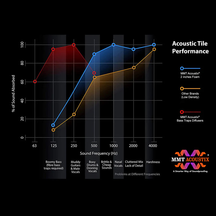 • ROOM ACOUSTICS: A 100% wall coverage will improve your sound quality significantly, whereas a limited wall coverage would only result in acoustic treatment of the space.