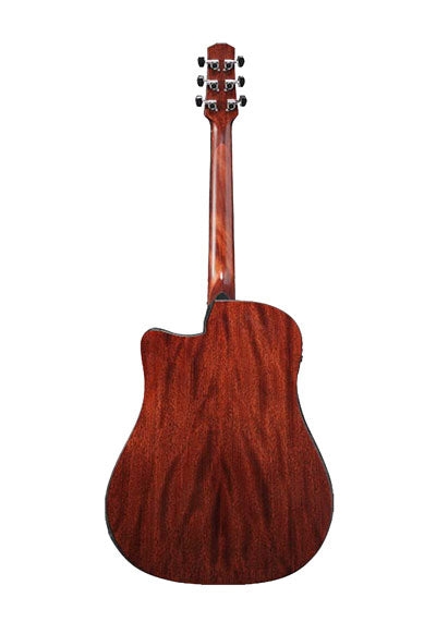 The Okoume back and sides generate a woody, warm tone when the guitar is played softly or finger-picked and provide punchy high-mids with a clear projection when strummed.