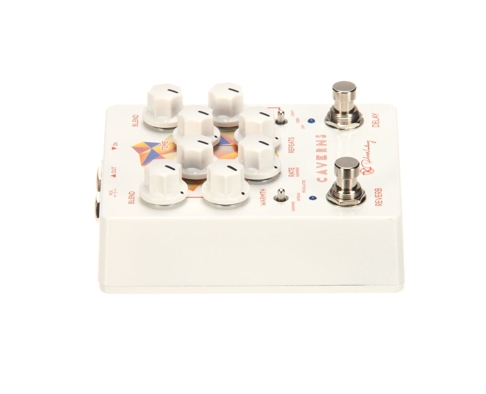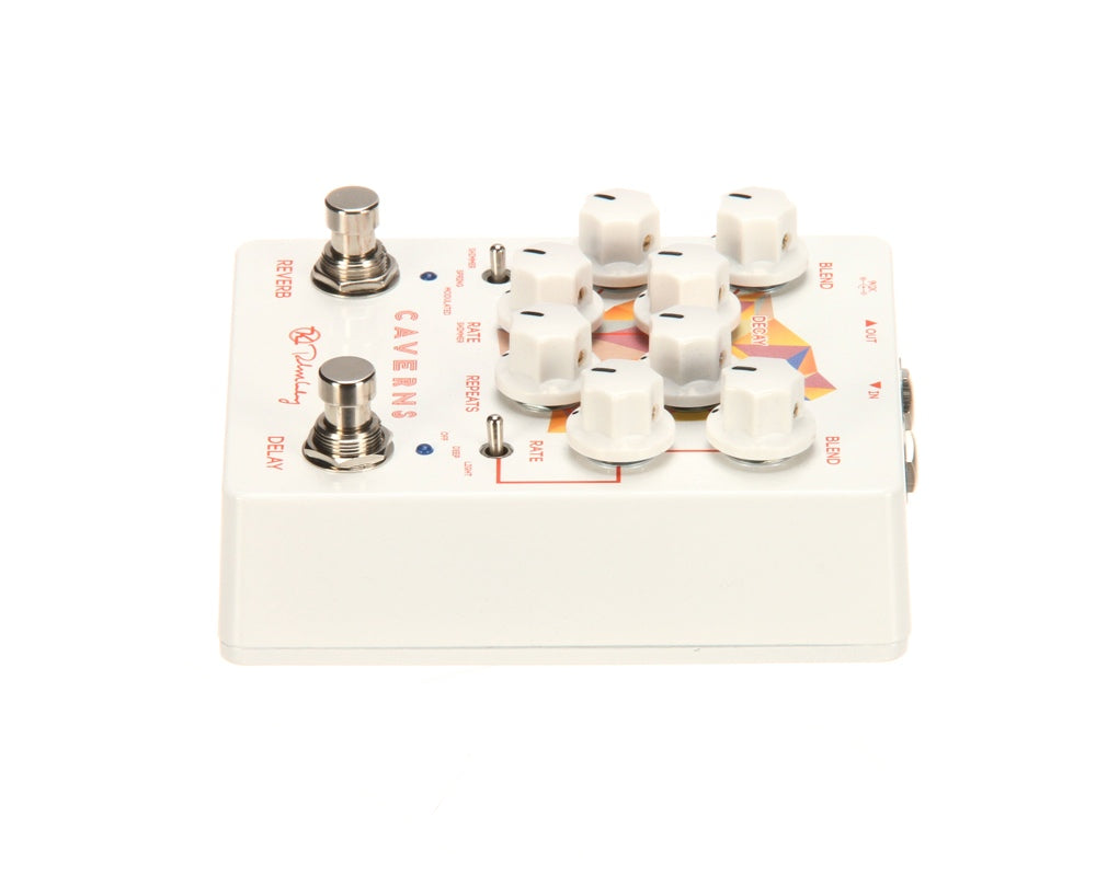 The New Caverns Delay Reverb V2 builds on the old Caverns pedal by giving players a more open and logical control layout with more space between the foot switches.