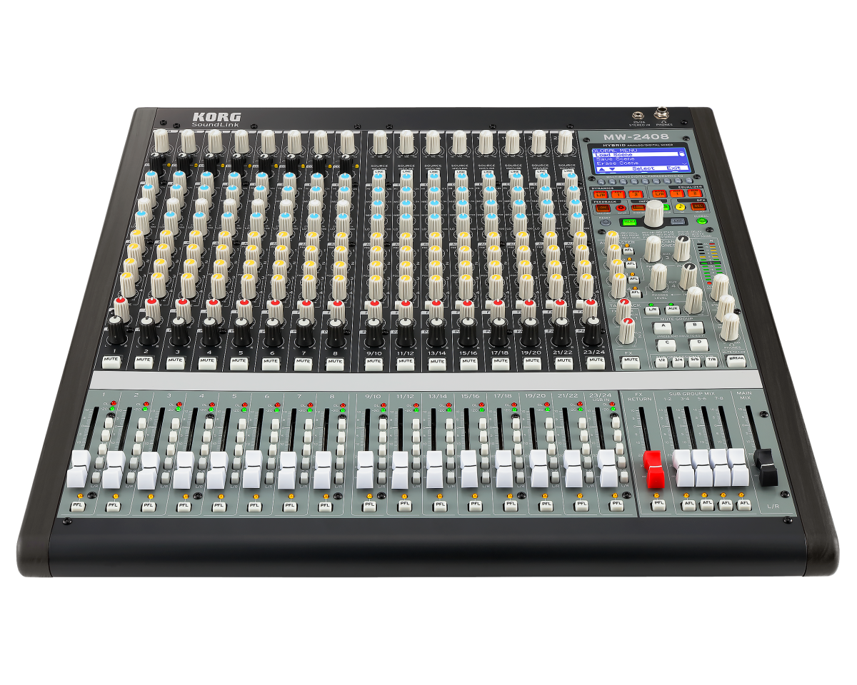 Korg has collaborated with the legendary mixer design team of Greg Mackie and Peter Watts to create hybrid/analog mixing consoles that make creative mixing easy. Both the 24- and 16-channel models give you instant analog control for live mixing with stunning sound quality and more musician-friendly features than the competition — paired with the power of high-quality digital where it counts.