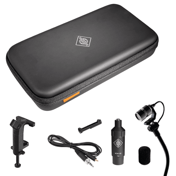 Complete set for using the Miniature Clip Mic system on the bell of a trumpet, trombone, saxophone or other horn, on percussion instruments and on pole stands. Contains: KK 14 capsule, SH 150 gooseneck, KC 1 cable brace, AC 31 cable, MCM 100 output stage, WS 110 wind shield, MC 6 clip. Delivered in a handy soft case.