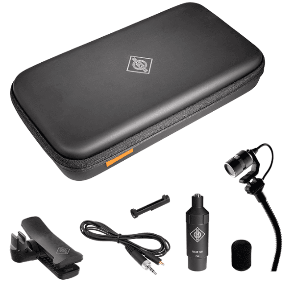 Complete set for using the Miniature Clip Mic system on the bell of a trumpet, trombone, saxophone or other horn, on percussion instruments and on pole stands. Contains: KK 14 capsule, SH 150 gooseneck, KC 1 cable brace, AC 31 cable, MCM 100 output stage, WS 110 wind shield, MC 6 clip. Delivered in a handy soft case.