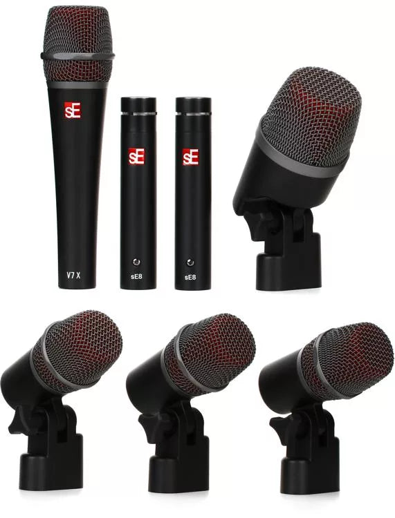 sE Electronics Drum Mic Bundle with 1 V Kick Dynamic Mic, 3 V Beat Dynamics, 3 V Clamps, 1 V7 X Supercardioid Dynamic, and 2 sE8 Condenser Mics- Extremely compact and low profile microphones for easy placement and positioning